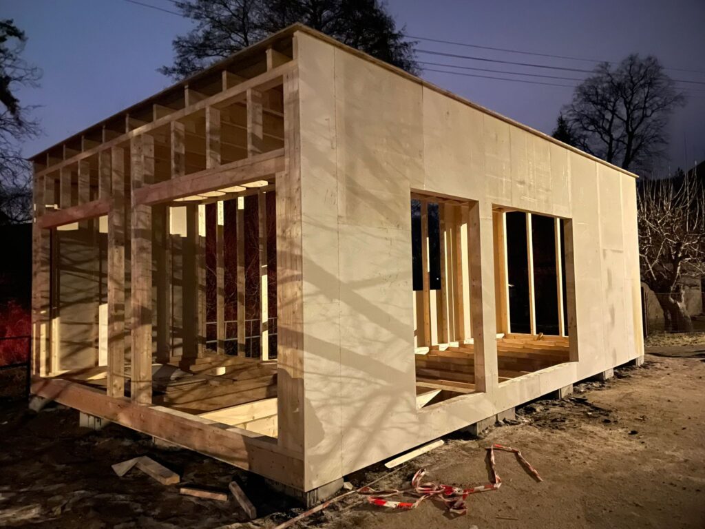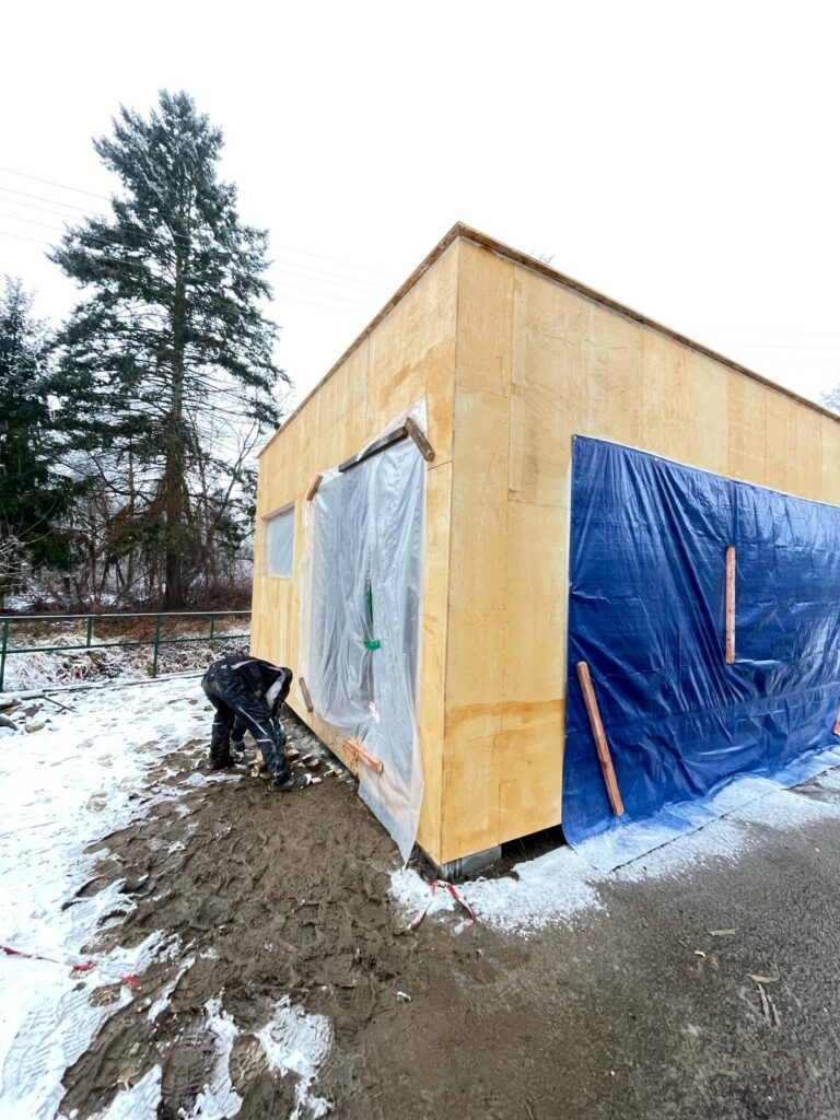 Fasáda budovy kombinuje bílé stěny s přírodním dřevem, což působí útulně a zároveň moderně. V pozadí je vidět prosklený vstup do vnitřních prostor domu, čímž se interiér propojuje s exteriérem. Celkově prostor působí otevřeně a přátelsky, ideální pro komunitní aktivity a venkovní posezení.