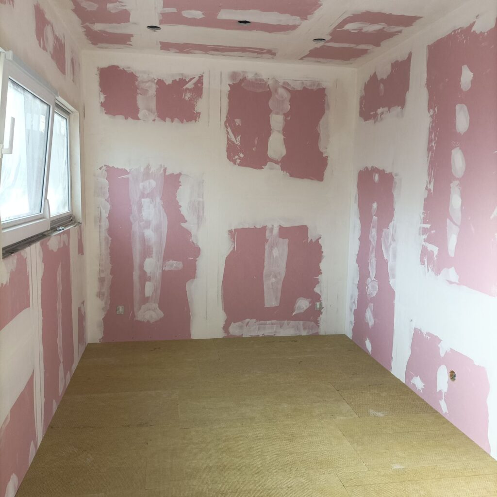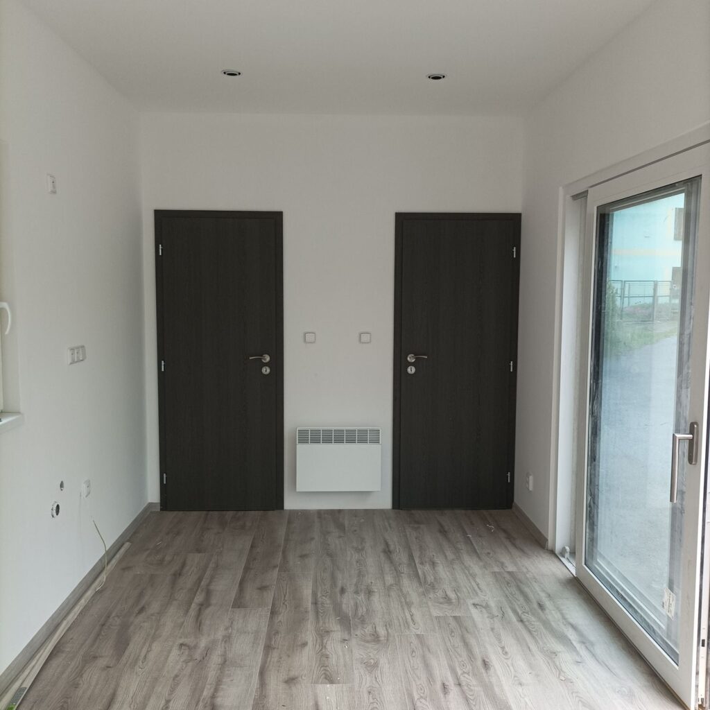 Interiér komunitního domu je navržen s důrazem na funkčnost a pohodlí. Místnost kombinuje prostor pro posezení s kuchyňským koutem.
